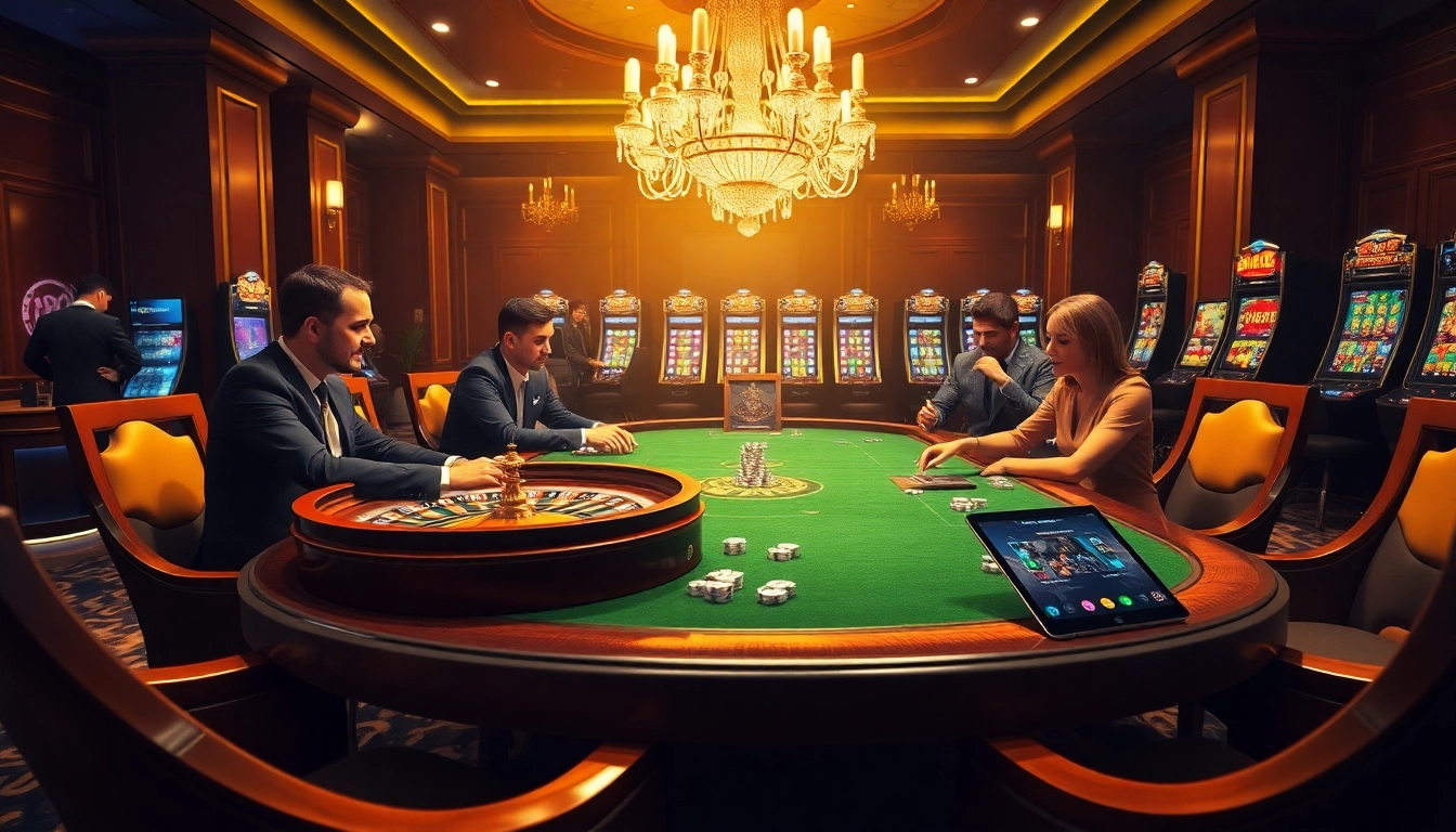 Players strategizing in a luxury casino setting at rikbet, enjoying poker and roulette.