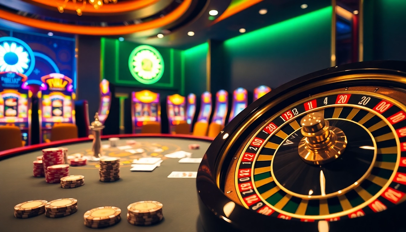 LUCK8 casino scene showcasing vibrant roulette action and poker chips.