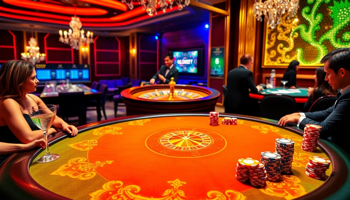 High-stakes poker action at https://mmoo1.de.com/ with vibrant chips, a spinning roulette, and elegant players.
