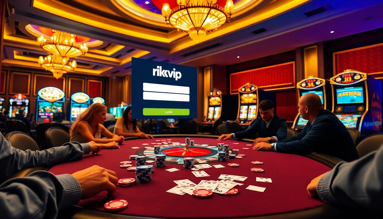 Rikvip đăng nhập interface displayed over an exciting casino scene with poker chips and cards.