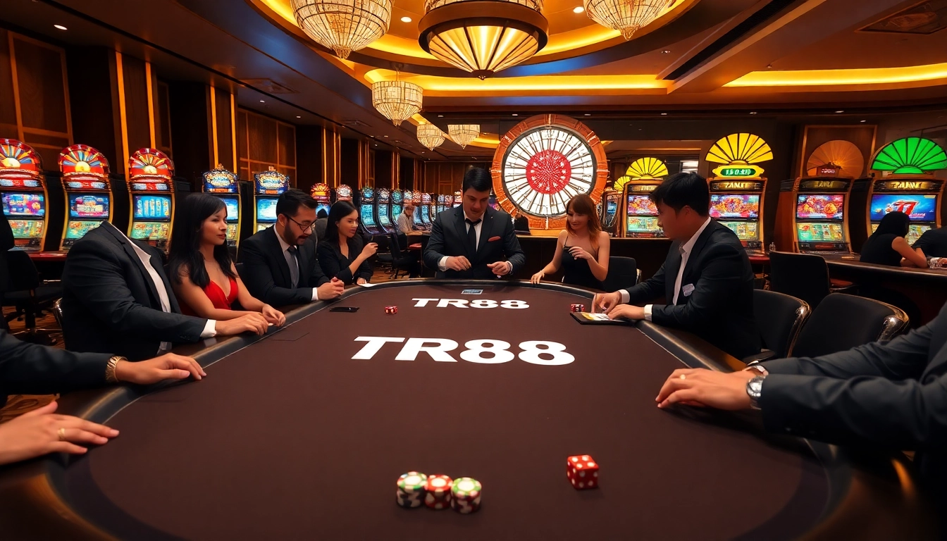 Players enjoying a game at TR88’s luxurious poker table in a vibrant casino atmosphere.