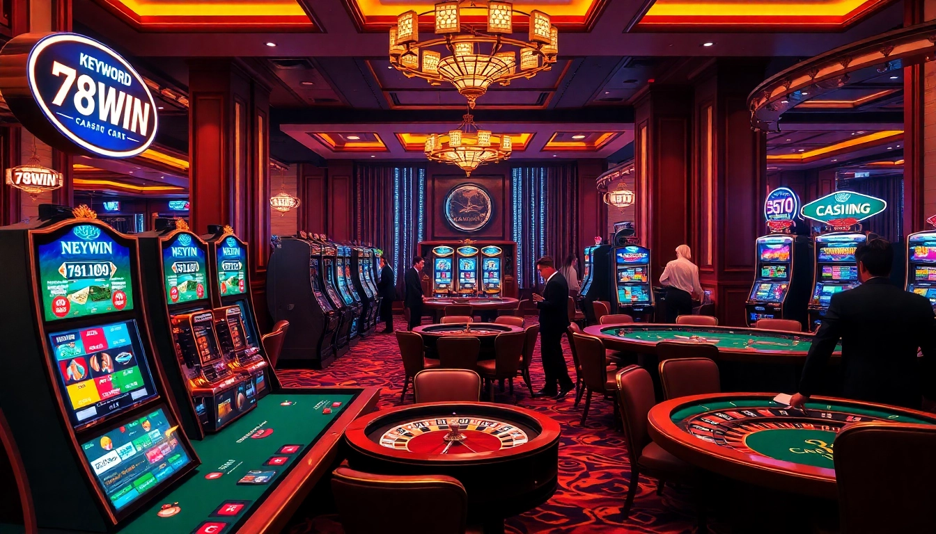Players enjoying thrilling games at 78WIN Casino, featuring colorful slots and lively poker tables.