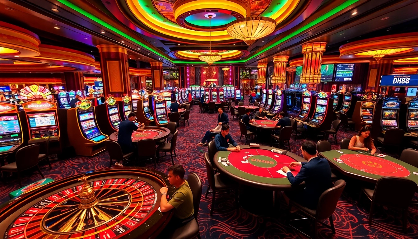 Experience thrilling gaming at DH88 with poker chips, roulette tables, and vibrant slot machines.