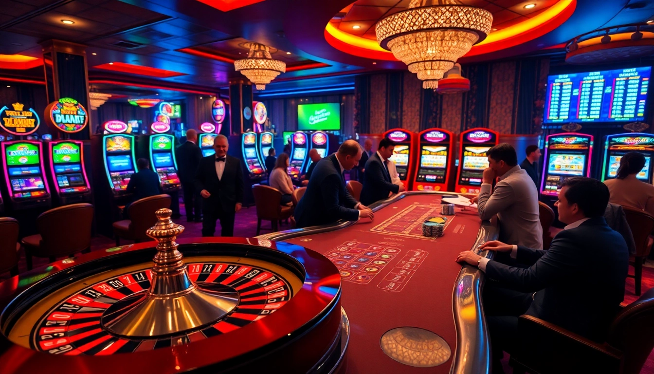 Experience the thrill of Ketquaxoso with an exciting casino scene featuring roulette, poker, and vibrant slot machines.